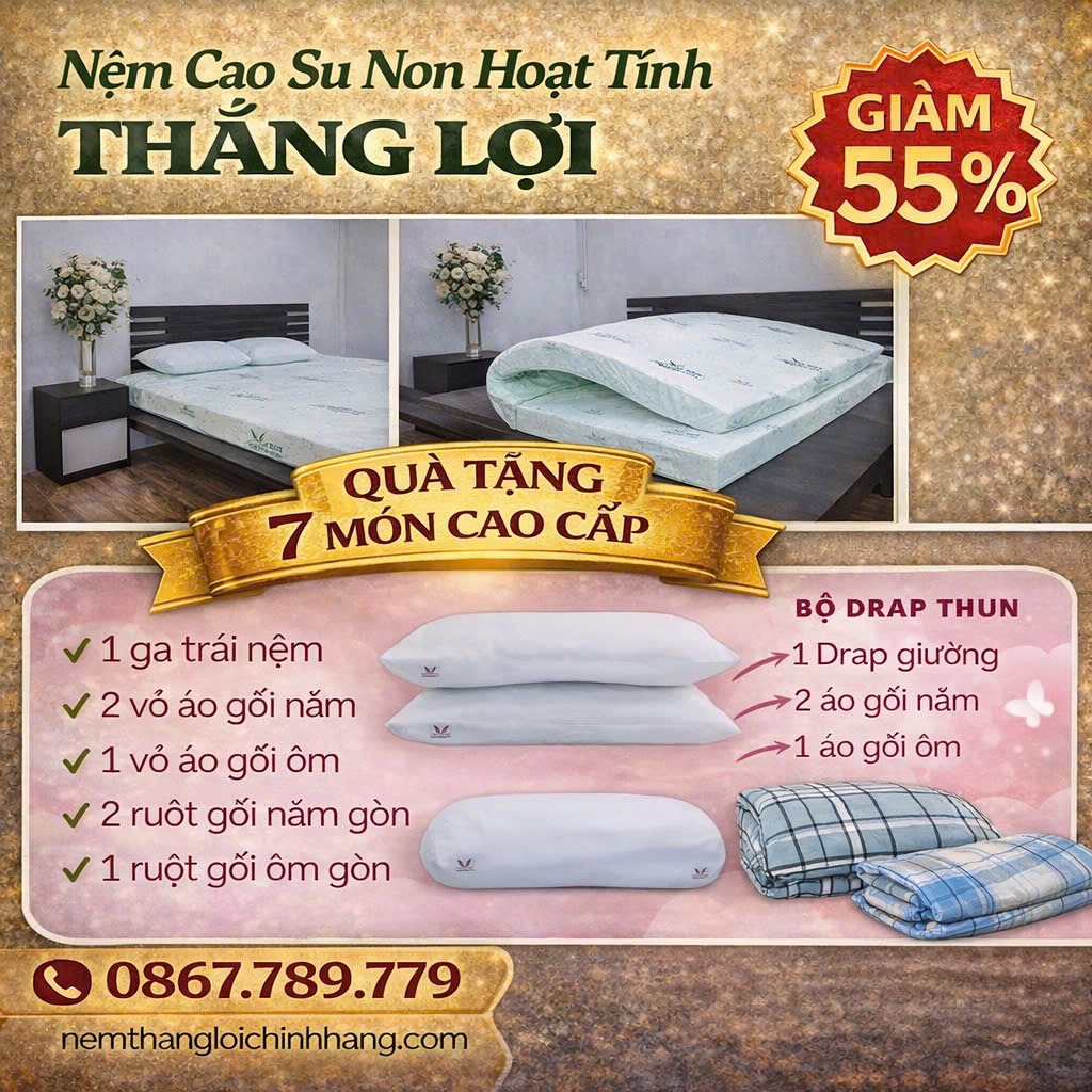 Nệm cao su hoạt tính Thắng Lợi được sản xuất 2 thành phần chính là giữa cao su non kết hợp với than hoạt tính.