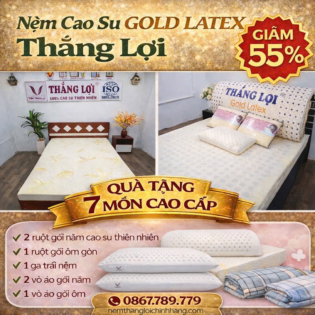 Nệm Cao Su Thắng Lợi Gold Latex là sản phẩm kết hợp giữa cao su tự nhiên và foam cao cấp, mang lại sự mềm mại, đàn hồi và hỗ trợ tối ưu cho giấc ngủ. Đây là dòng nệm được ưa chuộng nhờ tính năng hiện đại, thân thiện với môi trường và phù hợp với nhiều đối tượng sử dụng